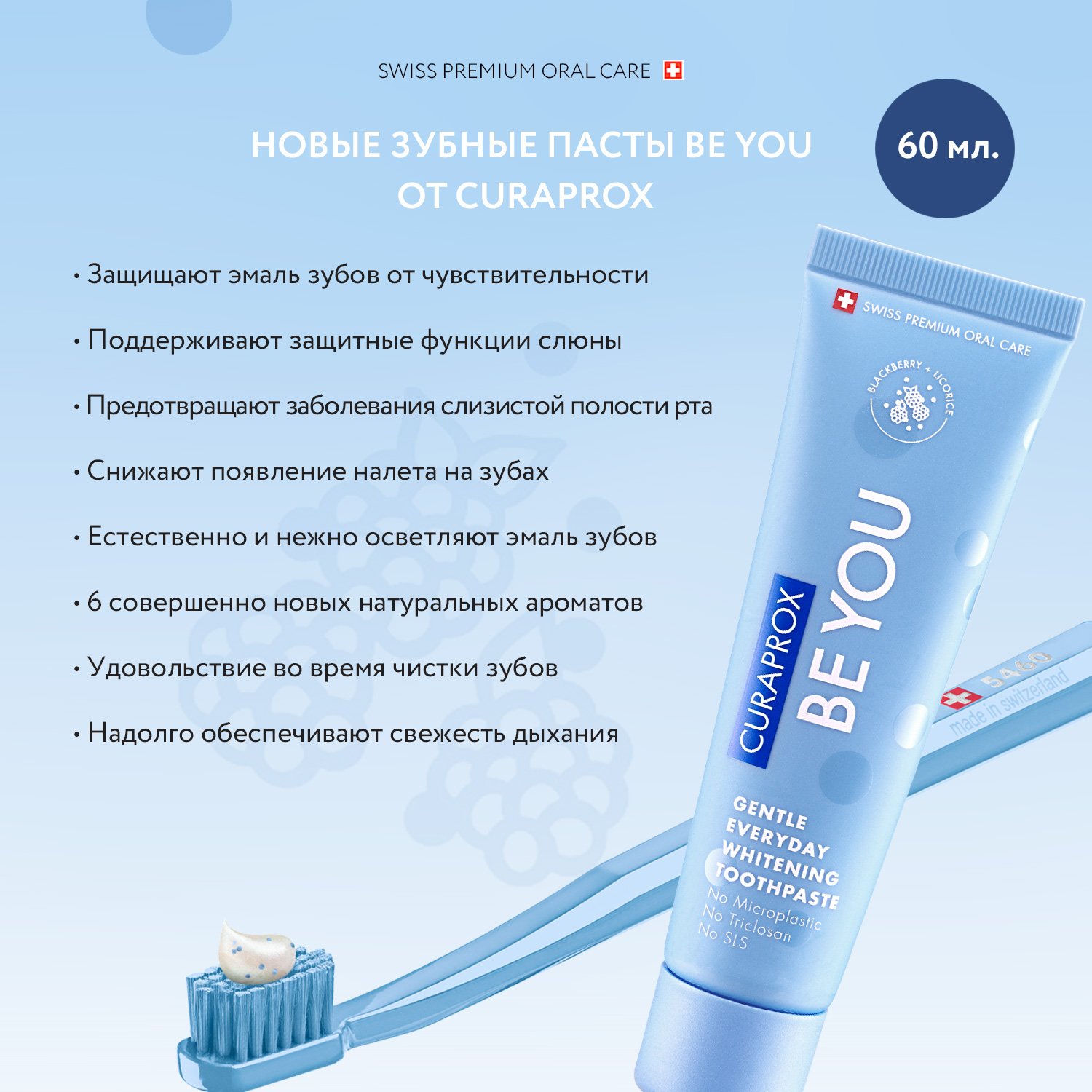 Осветляющая зубная паста Curaprox BE YOU со вкусом ежевики и лакрицы - паста комплексного действия. Содержит лактопероксидазную систему ферментов для защиты, восстановления и увлажнения слизистой.