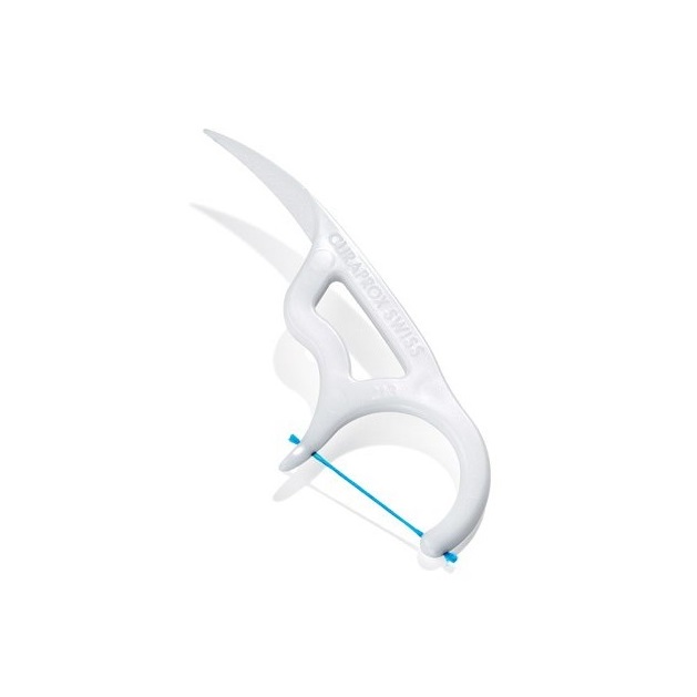Набор Flosspic Curaprox DF 967 включает в себя 30 шт. шелковой межзубной нити с пластиковым держателем, на конце которого находится зубочистка.