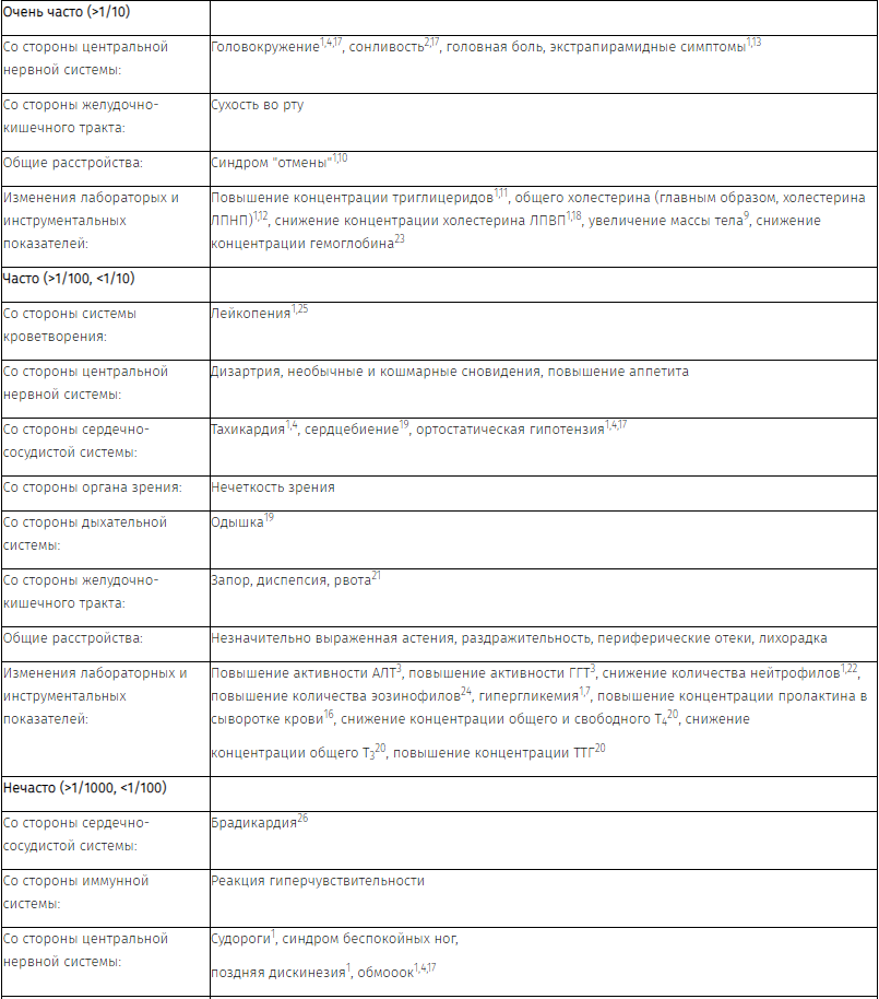 26. Может развиться в момент или вскоре после начала терапии и сопровождаться гипотензией и/или обмороком. Частота установлена на основании сообщений о развитии брадикардии и связанных нежелательных явлений во всех клинических исследованиях кветиапина.