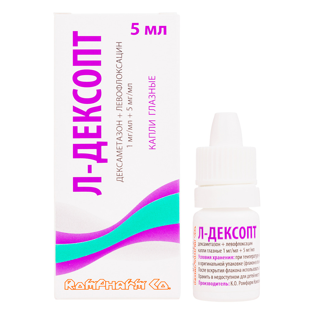 Действующие вещества: дексаметазона фосфат - 1,000 мг (в пересчёте на дексаметазона фосфат натрия - 1,0925 мг), левофлоксацин - 5,000 мг (в пересчёте на левофлоксацина гемигидрат - 5,120 мг);