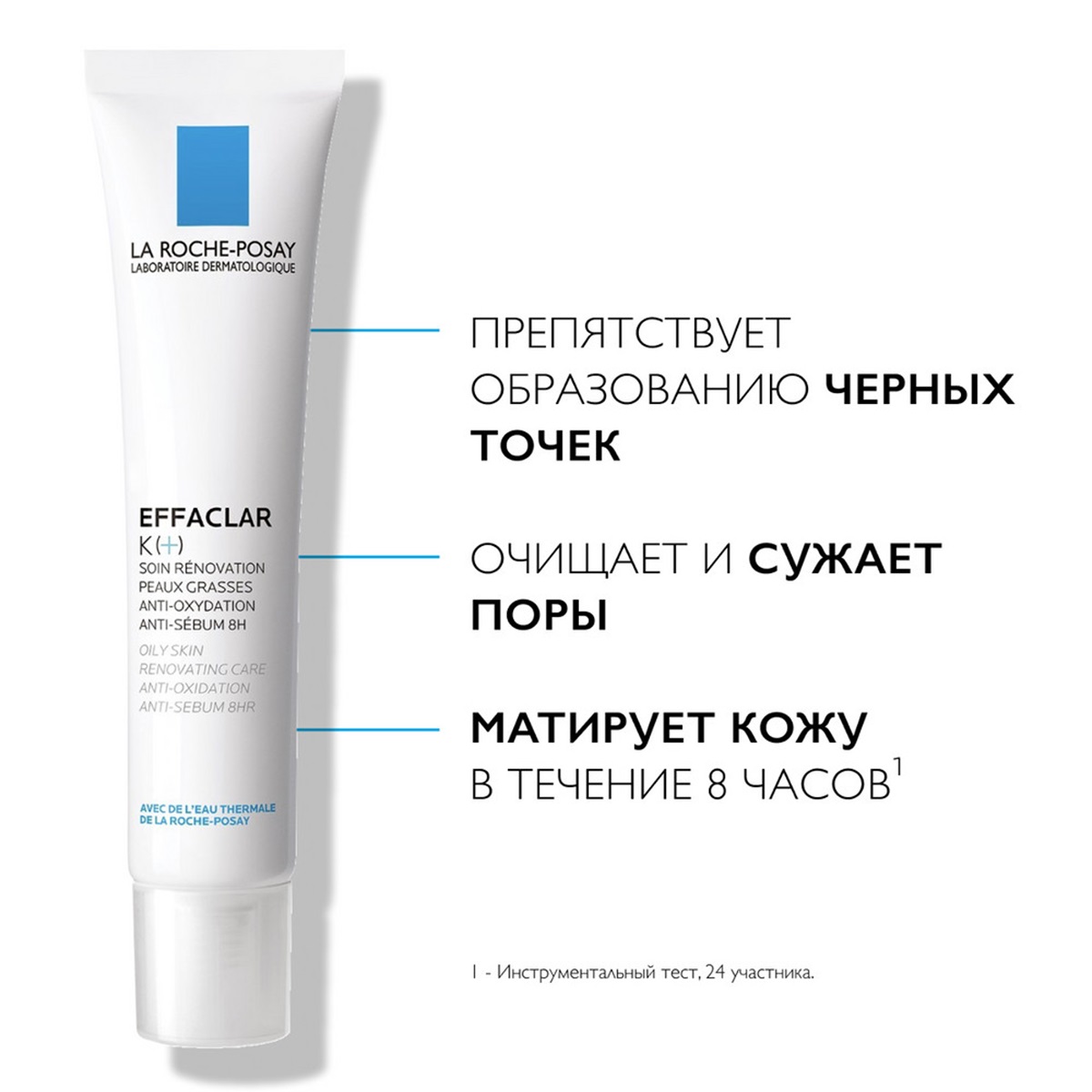 Средство для ежедневного ухода EFFACLAR K(+) сочетает в себе Липо-Гидроски-Кислоту, обладающую микроотшелушивающим действием, и комплекс [ВИТАМИН Е + КАРНОЗИН + AIRLICIUMТМ] с антиоксидативным и себорегулирующим действием в течение 8 часов. После первого применения Эфаклар К(+) появляется ощущение чистоты и свежести, которое сохраняется весь день. Всего за 1 месяц кожа преображается: рельеф кожи более ровный, поры очищены и сужены, жирный блеск под контролем. Средство обладает доказанным антирецидивным действие в отношении повторного появления несовершенств кожи и чёрных точек*