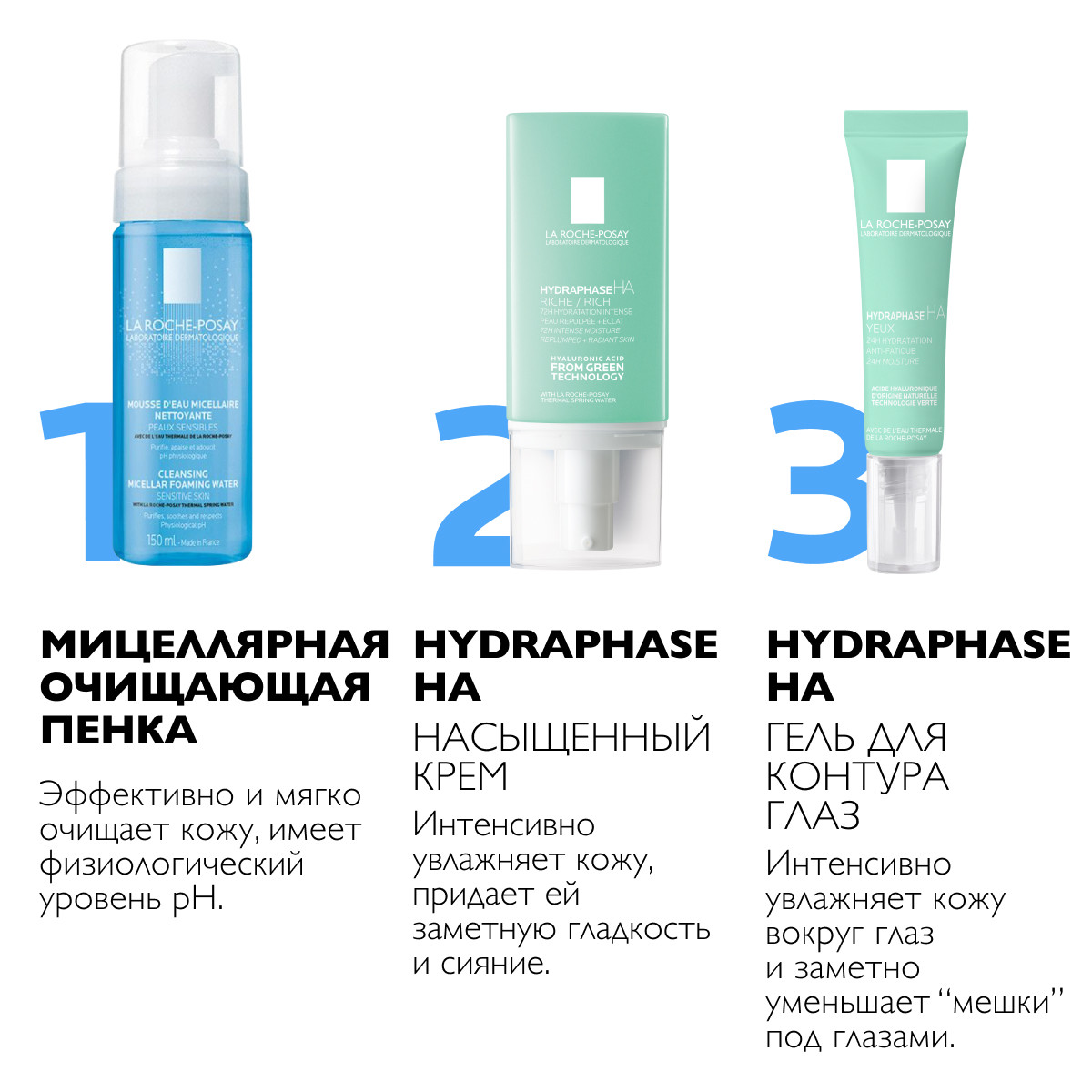 Формула, обогащенная [ГИАЛУРОНОВОЙ КИСЛОТОЙ] натурального происхождения, увлажняет кожу в течение 72 часов и придает коже заметную гладкость и сияние. [ТЕРМАЛЬНАЯ ВОДА LA-ROCHE POSAY] уменьшает чувство дискомфорта и защищает кожу.