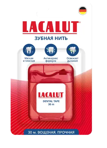 Зубная нить Lacalut dental tape с фторидом натрия снижает образование бактериального зубного налета и предупреждает развитие контактного кариеса.