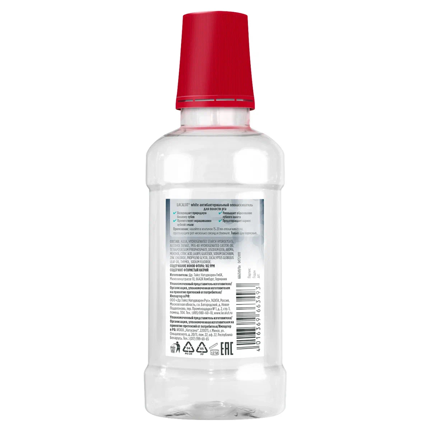 Aqua, Hydrogenated Starch Hydrolysate, Alcohol Denat., PEG-40 Hydrogenated Castor Oil, Tetrapotassium Pyrophosphate, Disodium EDTA, Aroma, Menthol, Citric Acid, Lauryl Glucoside, Sodium Saccharin, Zinc Chloride, Propylene Glycol, Eucalyptus Globulus Leaf Oil, Thymol, Sodium Fluoride.