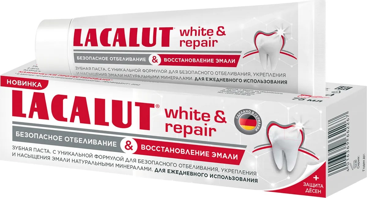 Уникальная комбинация активных веществ зубной пасты Lacalut® white & repair укрепляет, восстанавливает, бережно отбеливает зубную эмаль и обеспечивает защиту зубов и дёсен: