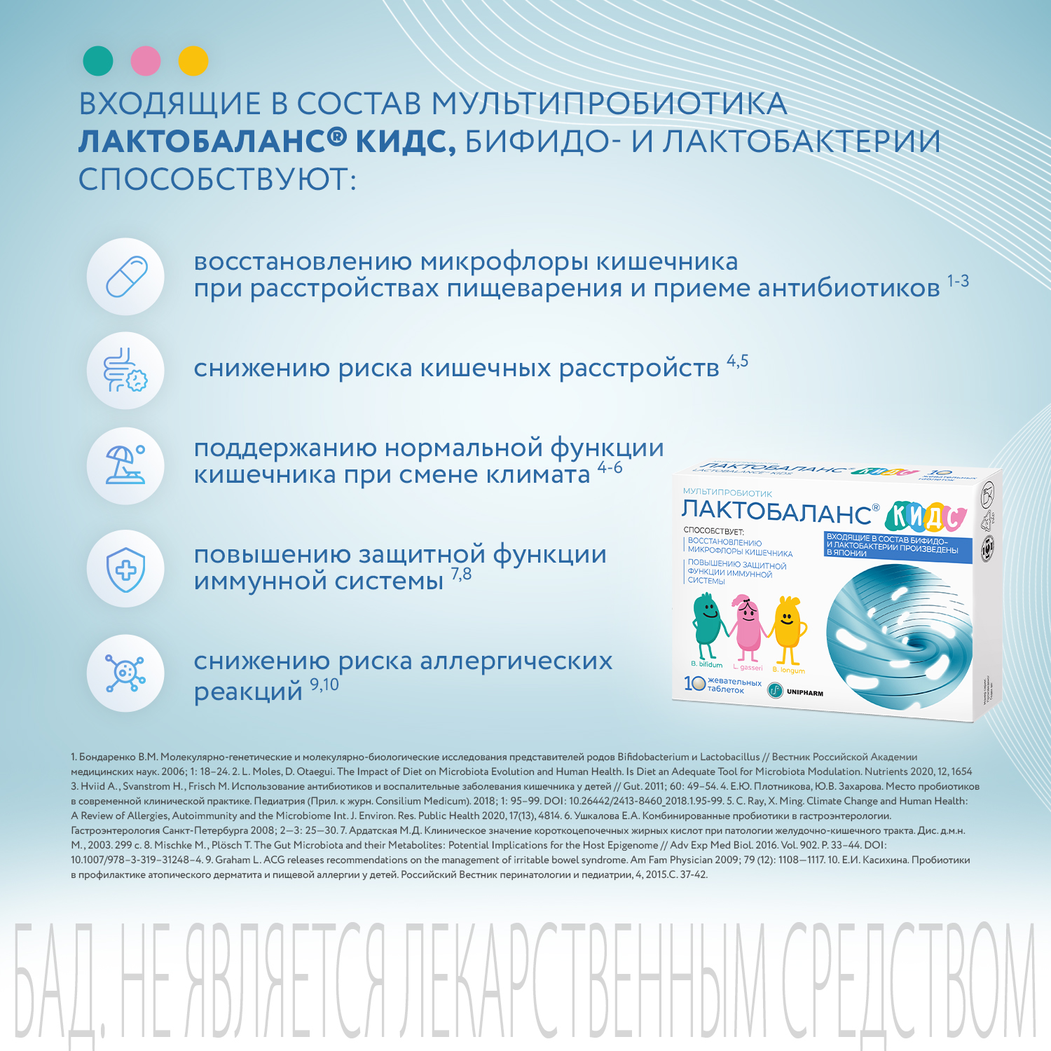 Каждая таблетка ЛАКТОБАЛАНС® КИДС содержит не менее одного миллиарда пробиотических микроорганизмов (1.0 х 109 КОЕ/таб.)