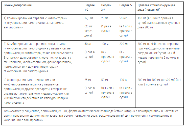 б) Комбинированная терапия с индукторами глюкуронизации ламотриджинау пациентов, НЕ принимающих ингибиторы, такие как валъпроаты. Этот режим должен использоваться с фенитоином, карбамазепином, фенобарбиталом, примидоном и другими индукторами глюкуронизации ламотриджина