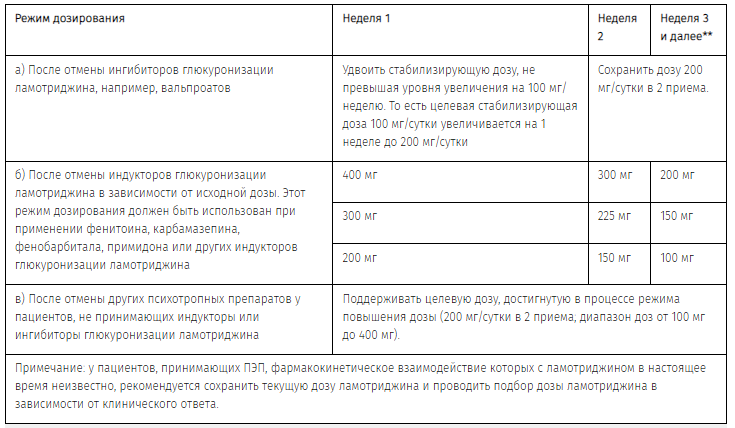 В случае возобновления применения ламотриджина врач должен оценить необходимость повышения до поддерживающей дозы препарата пациентам, которые прекратили его прием по какой-либо причине, поскольку высокие начальные дозы и отклонения от рекомендуемого режима повышения дозы сопровождаются риском развития тяжелой формы сыпи. Чем больше прошло времени после последнего приема препарата, тем с большей осторожностью следует повышать дозу препарата до поддерживающей. Если время после прекращения приема превышает 5 периодов полувыведения, то доза ламотриджина должна повышаться до поддерживающей согласно соответствующей схеме. Терапию ламотриджином не следует возобновлять у пациентов, прекращение лечения у которых было связано с появлением сыпи, кроме случаев, когда потенциальная польза от такой терапии очевидно превышает возможные риски.