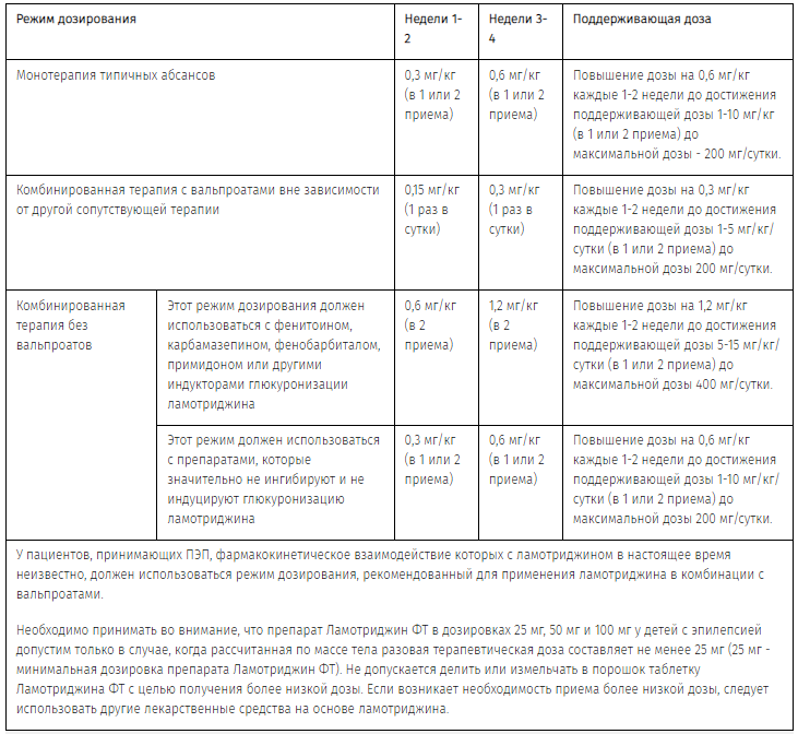 У пациентов, принимающих вальпроаты в сочетании с другими ПЭП или без них, начальная доза препарата Ламотриджин ФТ составляет 0,15 мг/кг/сутки 1 раз в сутки в течение 2 недель, в дальнейшем - 0,3 мг/кг/сутки 1 раз в сутки в течение 2 недель. Затем доза может быть увеличена максимально на 0,3 мг/кг каждые 1-2 недели до достижения оптимального терапевтического эффекта. Обычная поддерживающая доза для достижения оптимального терапевтического эффекта составляет 1-5 мг/кг/сутки в 1 или 2 приема. Максимальная доза составляет 200 мг/сутки.