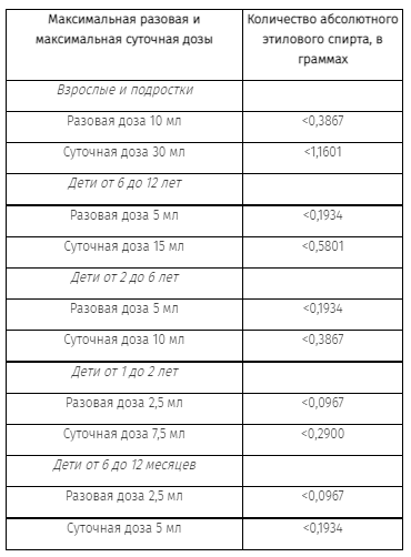Содержание абсолютного этилового спирта в граммах в максимальных разовых и суточных дозах препарата