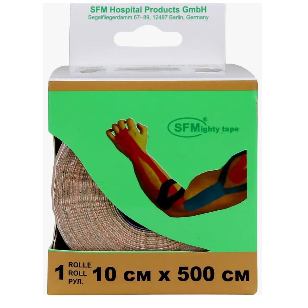 Лейкопластырь кинезио тейп используется для профилактики и лечения травм опорно-двигательного аппарата. Лейкопластырь кинезио тейп SFM 10 см Х 500 см, представляет собой эластичную хлопковую ленту на клейкой гипоаллергенной основе.