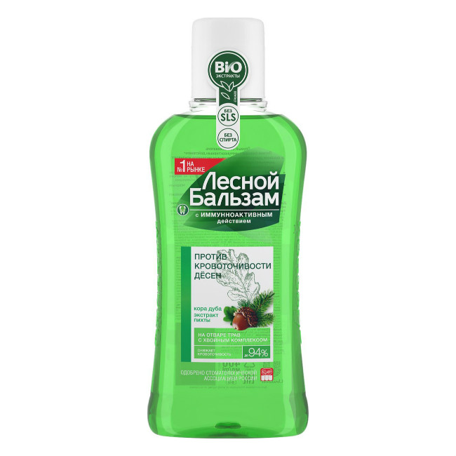 Новый ополаскиватель для полости рта Лесной бальзам c иммуноактивным действием помогает решить проблему кровоточивости десен и в 2 раза улучшает работу собственного иммунитета полости рта, снижая риск развития проблем с деснами1.
