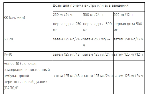 Дозы для пациентов с нарушением функции почек (КК менее 50 мл/мин):