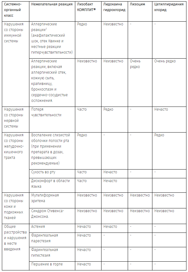 Сообщалось о случаях аллергических реакций (гиперчувствительности) в связи с применением лизоцима. Поэтому пациент должен прекратить применение препарата и обратиться к врачу в случаях возникновения сыпи, зуда или покраснения кожи, отека лица, губ, языка или горла, органов дыхания и/или затруднении при глотании, поскольку это могут быть признаки аллергической реакции на препарат Лизобакт Комплит®.