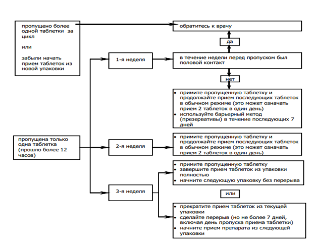 Соответственно, если опоздание в приеме таблеток составило более 12 часов (интервал с момента приема последней таблетки больше 36 часов), в зависимости от недели, когда была пропущена таблетка, могут быть даны следующие рекомендации: