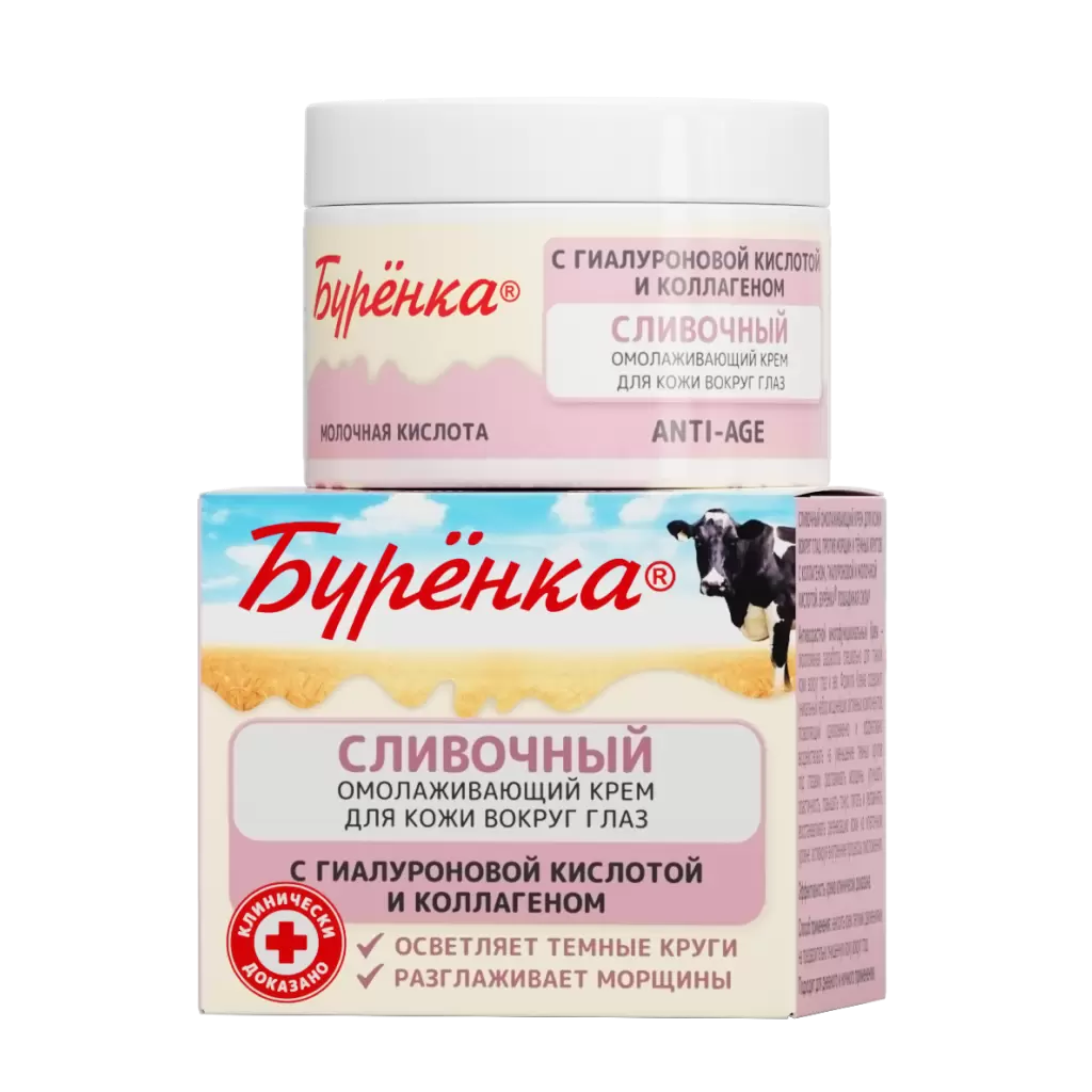 Омолаживающий, увлажняющий крем Буренка создан специально для ежедневного бережного ухода за нежной кожей вокруг глаз.