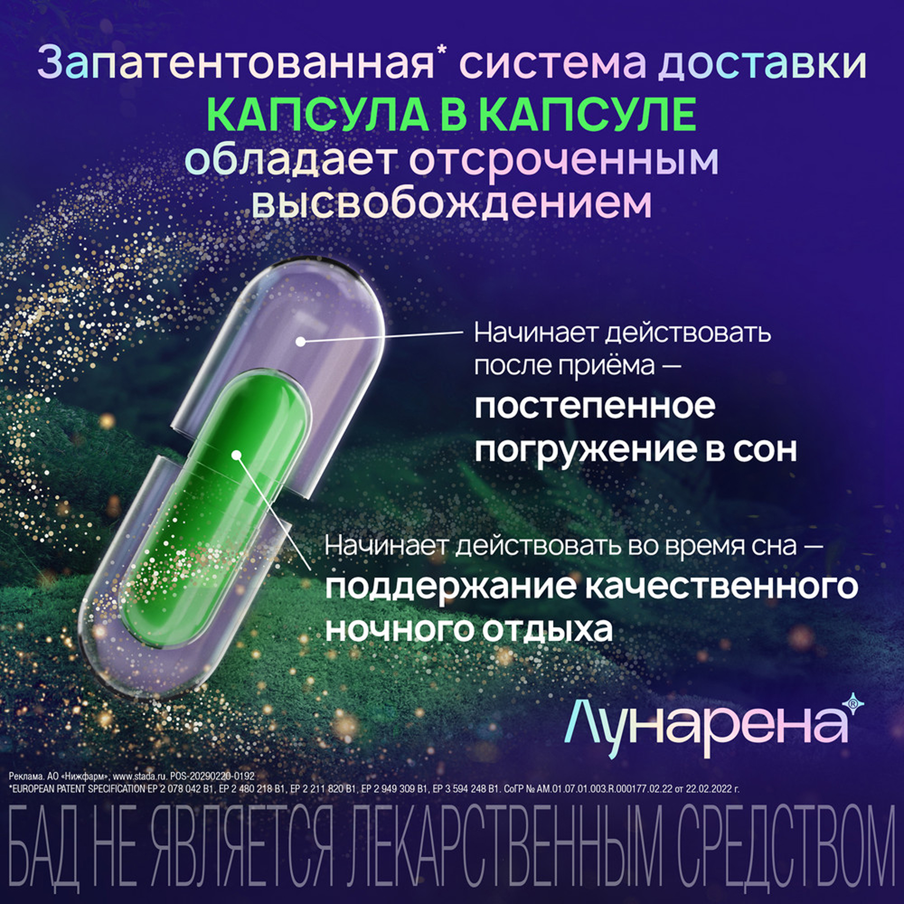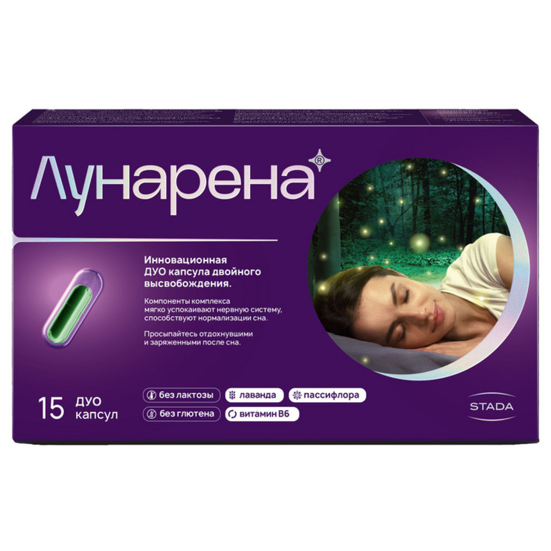 Лунарена - уникальная сбалансированной комбинация растительных компонентов и витамина B6, которые при совместном применении могут помочь сделать сон здоровым, крепким и полноценным, что позволит вам начать новый день отдохнувшими и полными сил! Экстракт пассифлоры инкарнатной и масло лаванды позитивно влияют на когнитивные функции и качество жизни. Стресс, чувство тревоги, беспокойства, страхи, навязчивые мысли, плохая гигиена сна, изменения в образе жизни или эмоционально-насыщенные события часто приводят к проблемам со сном. Качество и продолжительность сна могут оказывать существенное влияние на здоровье, ведь от качества сна зависит иммунитет, здоровье сердечно-сосудистой и эндокринной системы, когнитивные функции. Трудности засыпания, частые ночные пробуждения, поверхностный сон могут привести к усталости, нарушениям внимания и запоминания информации, расстройствам настроения, раздражительности, дневной сонливости, снижении мотивации и инициативности, склонности к ошибкам за рулем и на работе, мышечным напряжениям и головной боли. Благодаря своим компонентам в уникальной ДУО-капсуле (капсула в капсуле, DRcaps®) с отсроченным высвобождением, ЛУНАРЕНА может способствовать: Отдыху и расслаблению перед сном Легкости засыпания Качественному ночному сну С этого момента просыпайтесь отдохнувшими и заряженными после качественного сна. УНИКАЛЬНАЯ ТЕХНОЛОГИЯ: инновационная капсула двойного высвобождения может действовать на двух уровнях: мягко успокаивать нервную систему и способствовать нормализации сна. Эфирное масло лаванды (Lavandula Angustifolia Mill, 80 мг): помогает снижать уровень тревожности и стресса, смягчает возбудимость и раздражительность, помогает организму справляться с физическими и эмоциональными перегрузками, способствует снижению напряжения и усталости после трудного рабочего дня, уменьшению тревожности. Экстракт пассифлоры инкарнатной (Passiflora incarnata, 200 мг): оказывая мягкое успокаивающее действие на нервную систему и воздействуя на цикл сон-бодрствование (показано в экспериментальных исследованиях), может позитивно влиять на качество и продолжительность сна, что поможет вам спать крепче и проснуться отдохнувшими и полными сил. Витамин B6: поддерживает нормальное функционирование нервной системы, а также участвует в иммунных реакциях организма. Кроме того, имеются данные, что прием витамин B6 перед сном может сделать сновидения более запоминающимися. Инновационная капсула двойного высвобождения ЛУНАРЕНА — это не только уникальная комбинация компонентов, но и способ выпуска — капсула в капсуле — который был исследован и оптимизирован. Наружная капсула растворяется после проглатывания и высвобождает эфирное масло лаванды, которое может способствовать более спокойному засыпанию и оптимально подготовить вас к спокойному ночному сну. Внутренняя капсула благодаря технологии отсроченного высвобождения постепенно высвобождает экстракт пассифлоры инкарнатной и витамин B6 после приема внутрь, что позволяет им усваиваться, когда вы уже заснули. Компоненты, входящие в состав ЛУНАРЕНА: масло лавандовое, экстракт пассифлоры, витамин B6 могут способствовать уменьшению чувства тревоги, стресса, улучшению продолжительности и качества сна. Наружная капсула состоит из рыбьего желатина. Внутренняя капсула о