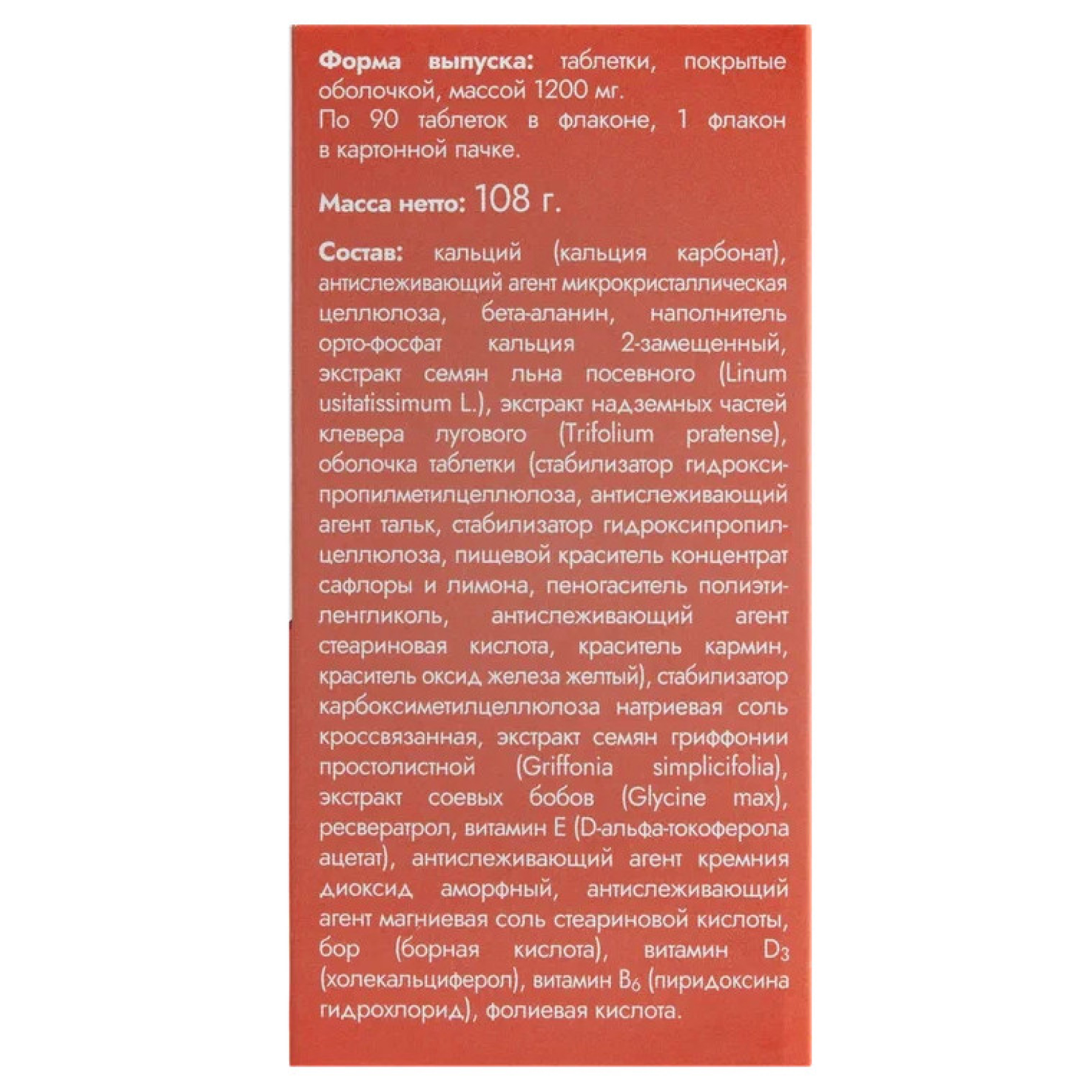 Кальций (кальция карбонат), антислеживающий агент микрокристаллическая целлюлоза, бета-аланин, наполнитель орто-фосфат кальция 2-замещенный, экстракт семян льна посевного (Linum usitatissimum L.), экстракт надземных частей клевера лугового (Trifolium pratense), оболочка таблетки (стабилизатор гидроксипропилметилцеллюлоза, антислеживающий агент тальк, стабилизатор гидроксипропилцеллюлоза, пищевой краситель концентрат сафлоры и лимона, пеногаситель полиэтиленгликоль, антислеживающий агент стеариновая кислота, краситель кармин, краситель оксид железа желтый), стабилизатор карбоксиметилцеллюлоза натриевая соль кроссвязанная, экстракт семян гриффонии простолистной (Griffonia simplicifolia), экстракт соевых бобов (Glycine max), ресвератрол, витамин E (D-альфа-токоферола ацетат), антислеживающий агент кремния диоксид аморфный, антислеживающий агент магниевая соль стеариновой кислоты, бор (борная кислота), витамин D3 (холекальциферол), витамин В6 (пиридоксина гидрохлорид), фолиевая кислота.