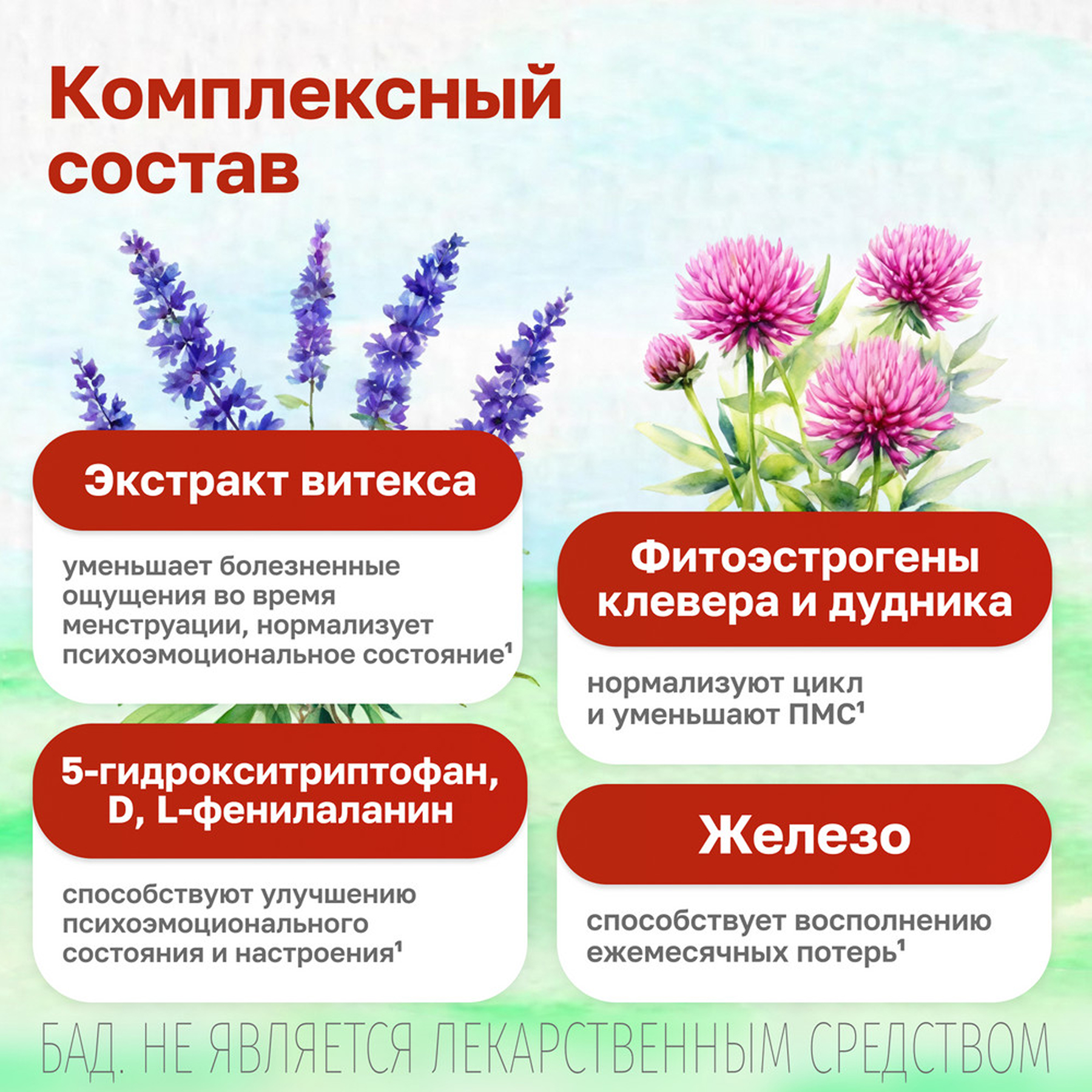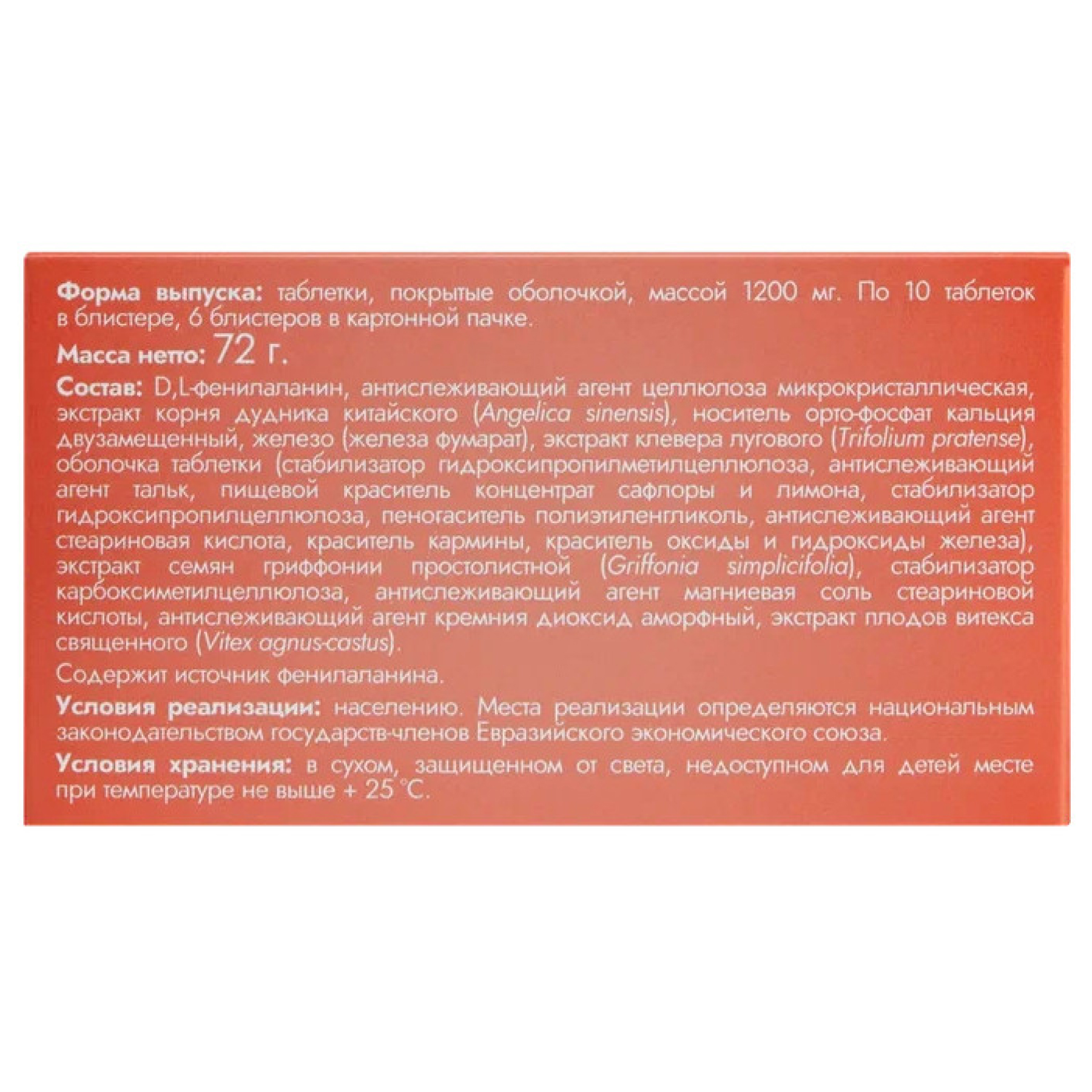 D,L-фенилаланин, антислеживающий агент целлюлоза микрокристаллическая, экстракт корня дудника китайского (Angelica sinensis), носитель орто-фосфат кальция двузамещенный, железо (железа фумарат), экстракт клевера лугового (Trifolium pratense), оболочка таблетки (стабилизатор гидроксипропилметилцеллюлоза, антислеживающий агент тальк, пищевой краситель концентрат сафлоры и лимона, стабилизатор гидроксипропилцеллюлоза, пеногаситель полиэтиленгликоль, антислеживающий агент стеариновая кислота, краситель кармины, краситель оксиды и гидроксиды железа), экстракт семян гриффонии простолистной (Griffonia simplicifolia), стабилизатор карбоксиметилцеллюлоза, антислеживающий агент магниевая соль стеариновой кислоты, антислеживающий агент кремния диоксид аморфный, экстракт плодов витекса священного (Vitex agnus-castus).