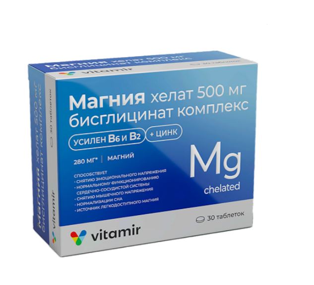 Магния хелат (бисглицинат) 500 мг комплекс с витаминами и цинком — биологически активная добавка к пище, дополнительный источник магния в легкодоступной форме, цинка и витаминов В2 и В6. Эти составляющие способствуют снятию мышечного напряжения, нормальной работе сердечно-сосудистой и нервной систем, а также необходимы для нормального сна.
