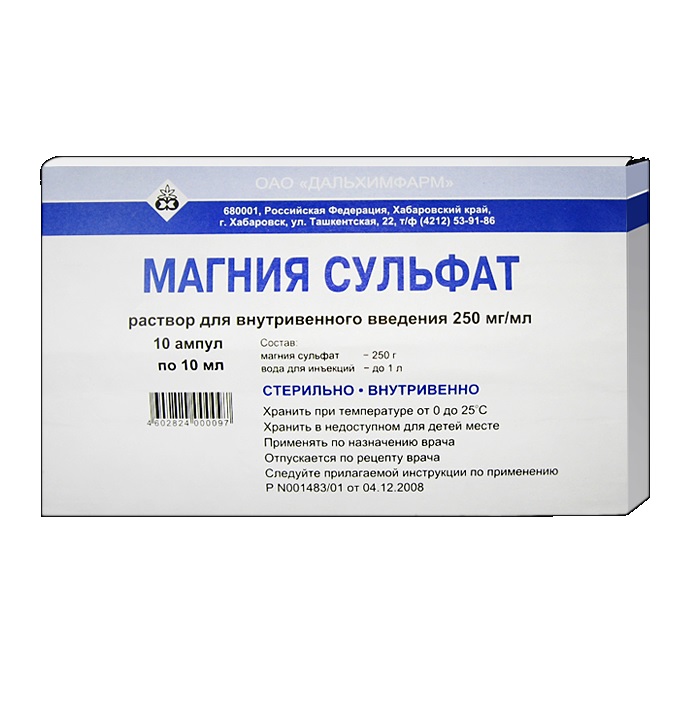 Раствор магния сульфата в ампулах разбавляют инъекционными растворами: 0,9% натрия хлорида или 5% декстрозы (глюкозы).