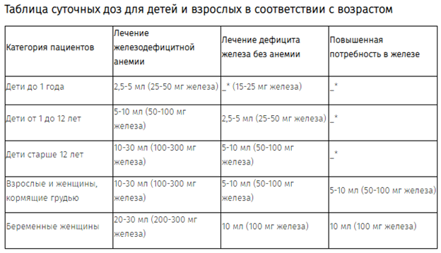 Суточная доза препарата зависит от степени дефицита железа (см. таблицу суточных доз).