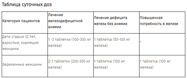 Суточная доза препарата зависит от степени дефицита железа (см. таблицу суточных доз).