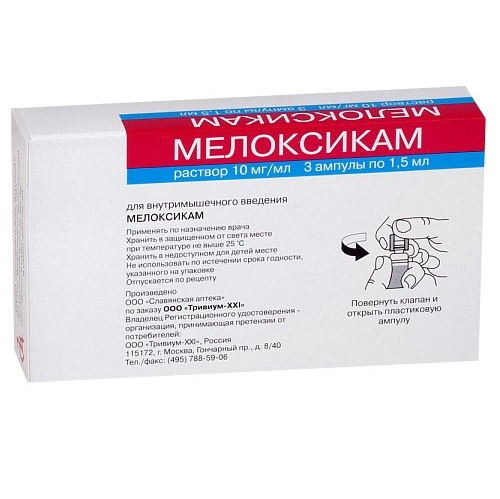 Мелоксикам полностью абсорбируется после внутримышечного введения. Относительная биодоступность по сравнению с биодоступностью при приеме внутрь составляет почти 100%. После внутримышечного введения препарата в дозе 5 мг максимальная концентрация в крови составляет 1,62 мкг/мл и достигается в течение приблизительно 60 минут. Мелоксикам хорошо связывается с белками плазмы крови, особенно с альбумином (99%). Проникает в синовиальную жидкость. Концентрация в синовиальной жидкости составляет примерно 50% концентрации в плазме. Объем распределения - в среднем 11 л. Межиндивидуальные отклонения составляют 30-40%. Мелоксикам почти полностью метаболизируется до 4 фармакологических инертных метаболитов. Основной метаболит, 5-карбоксимелоксикам (60% дозы), образуется путем окисления промежуточного метаболита 5-гидроксиметилмелоксикама. Исследования in vitro показали, что в данном метаболическом превращении важную роль играет изофермент CYP2C9, дополнительное значение имеет изофермент CYP3A4. В образовании двух других метаболитов (составляющих соответственно 16 и 4% от величины дозы препарата) принимает участие пероксидаза, активность которой может индивидуально варьировать. Экскреция мелоксикама, преимущественно в форме метаболитов, осуществляется в одинаковом количестве с мочой и калом. В неизмененном виде с калом выводится менее 5% от величины суточной дозы. В моче в неизмененном виде препарат обнаруживается только в следовых количествах. Средний период полувыведения составляет около 20 ч. Плазменный клиренс - в среднем 8 мл/мин. Мелоксикам демонстрирует линейную фармакокинетику в дозах 7,5-15 мг при внутримышечном введении.
