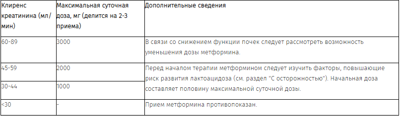 В случае КК менее 30 мл/мин применение метформина противопоказано. Следует проявлять особую осторожность при возможном нарушении функции почек у пожилых пациентов, при дегидратации (хроническая или тяжелая диарея, многократные приступы рвоты), при одновременном применении гипотензивных препаратов, диуретиков или нестероидных противовоспалительных препаратов.