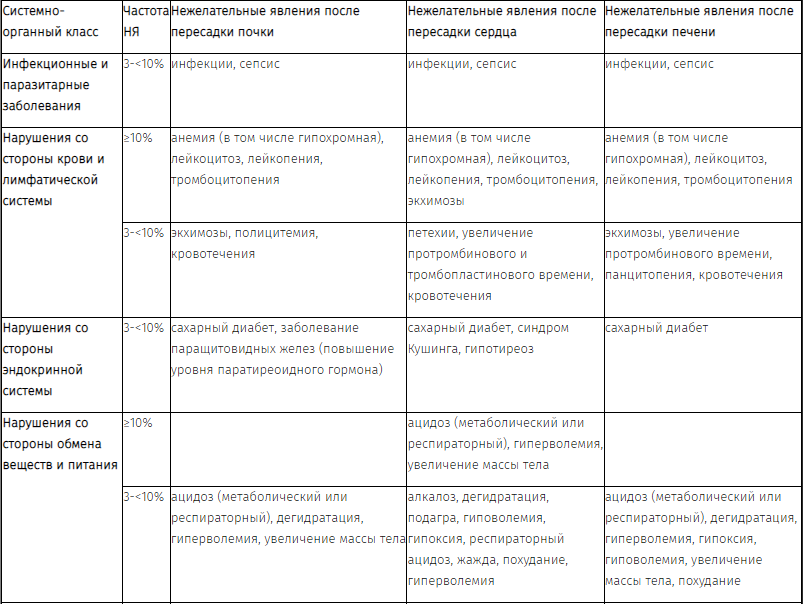 данные по безопасности и эффективности препарата у пациентов детского возраста после пересадки сердца или печени отсутствуют.