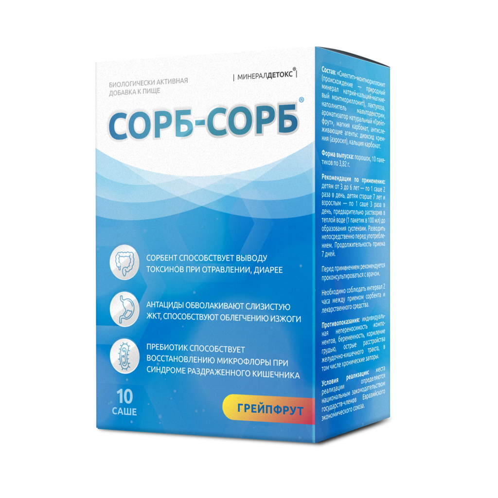 КОМПЛЕКСНОСТЬ. Благодаря сочетанию специально подобранных компонентов «Сорб-Сорб®» может быть рекомендован при синдроме раздраженного кишечника, отравлении, диарее, дисбактериозах, изжоге, вздутии, а также как обволакивающее средство для вывода из организма радионуклидов, токсинов и других чужеродных соединений.