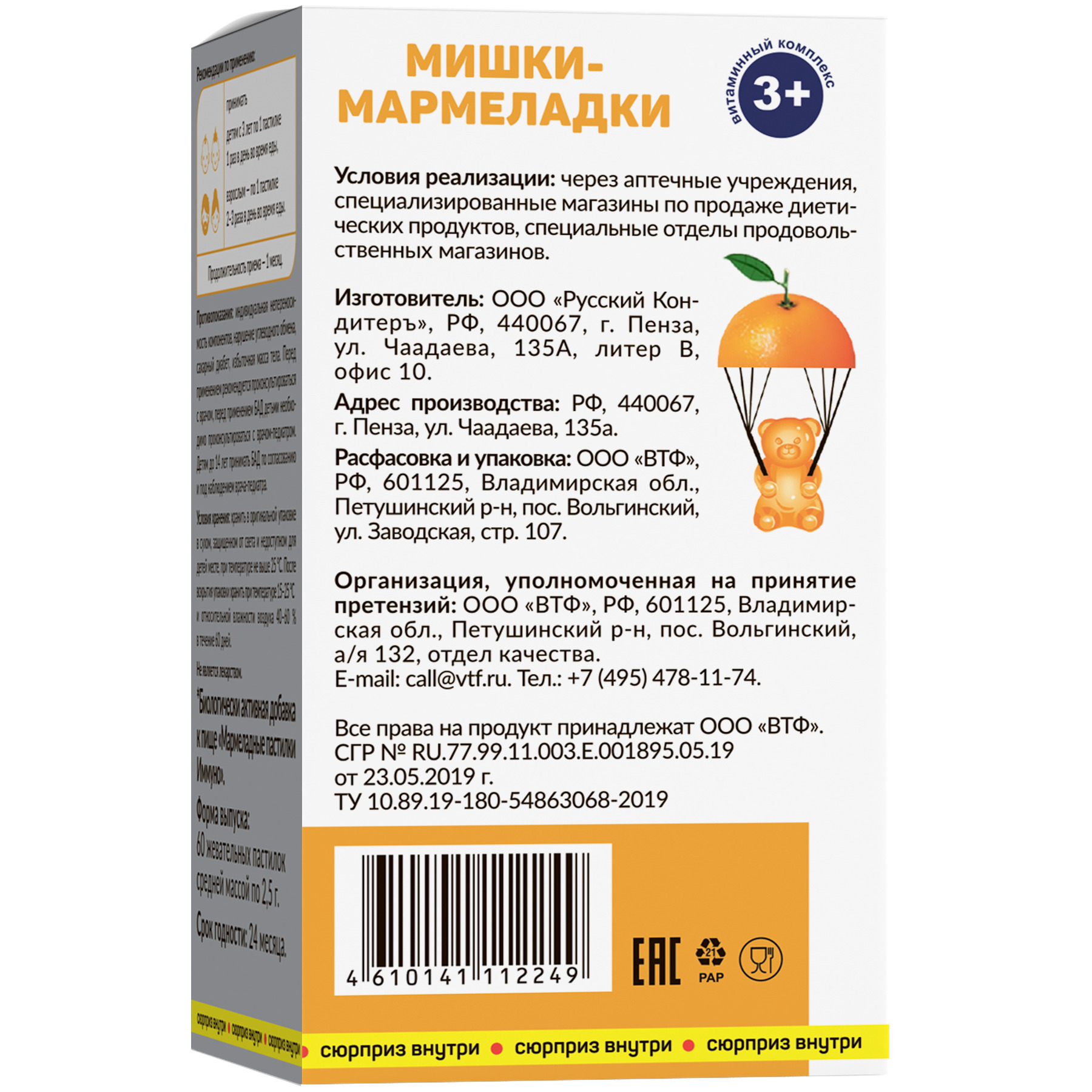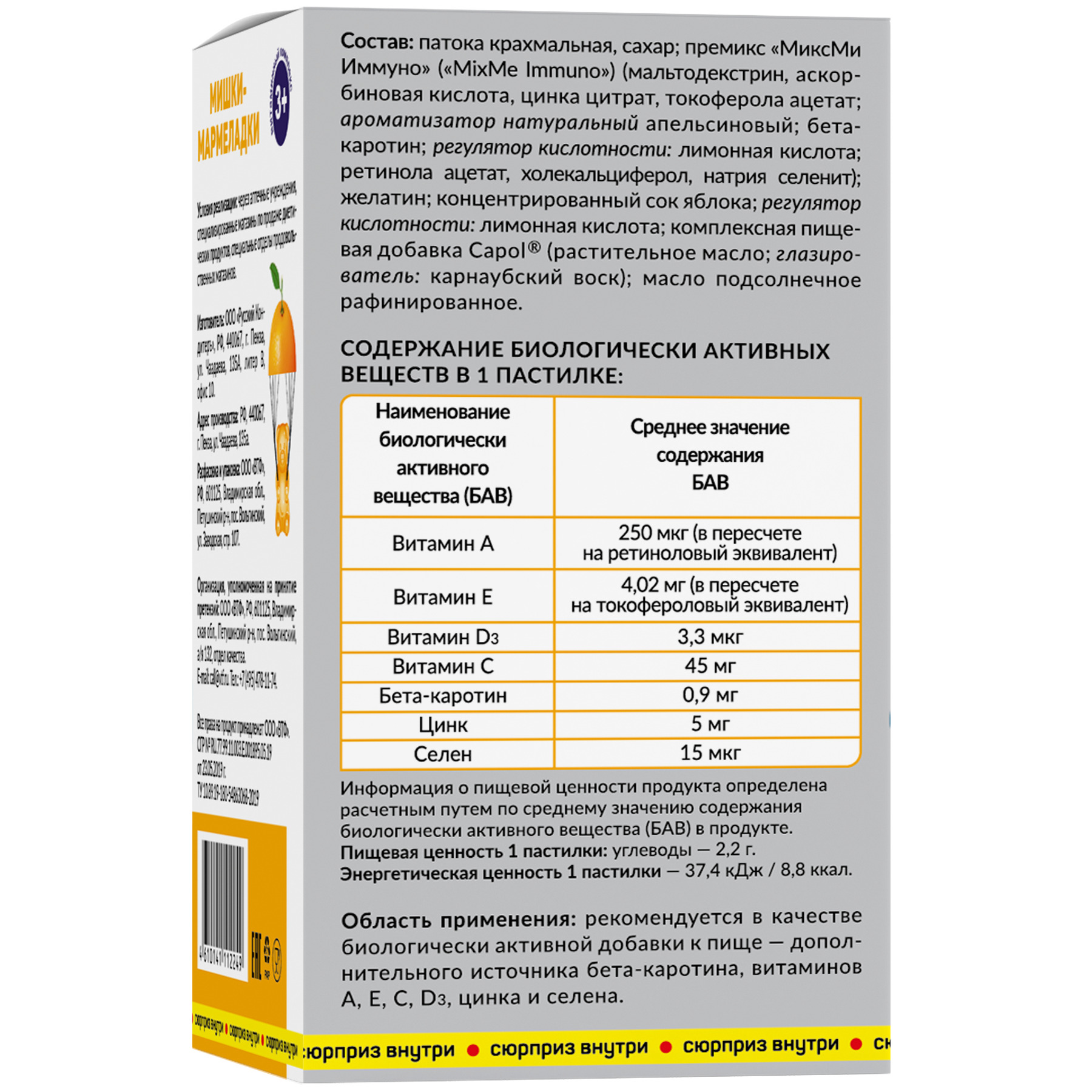 Вспомогательные вещества: патока крахмальная, сахар; премикс «МиксМи Иммуно» («MixMe Immuno») (мальтодекстрин, ароматизатор натуральный апельсиновый; регулятор кислотности: лимонная кислота; натрия селенит); желатин; концентрированный сок яблока; регулятор кислотности: лимонная кислота; комплексная пищевая добавка Capol® (растительное масло; глазирователь: карнаубский воск); масло подсолнечное рафинированное.