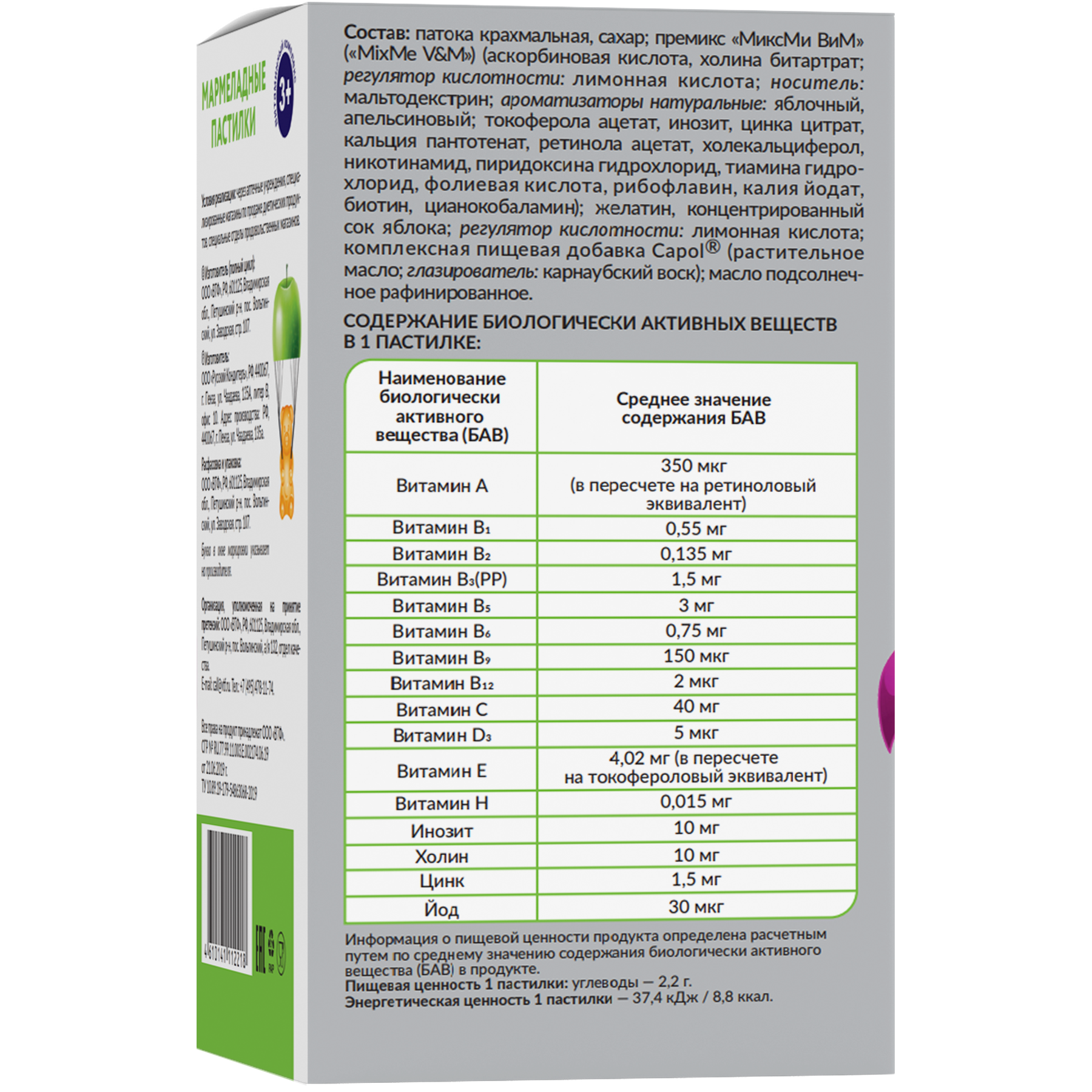 Вспомогательные вещества: патока крахмальная; сахар; премикс «МиксМи ВиМ» («MixMe V&M») (регулятор кислотности: лимонная кислота; носитель: мальтодекстрин; ароматизатор натуральный апельсиновый и яблочный); желатин; концентрированный сок яблока; регулятор кислотности: лимонная кислота; комплексная пищевая добавка Capol® (растительное масло; глазирователь: карнаубский воск); масло подсолнечное рафинированное.