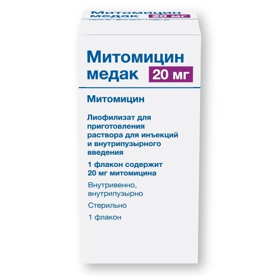 Митомицин представляет собой цитостатическое лекарственное средство из группы алкилирующих препаратов. Антибиотик с противоопухолевым эффектом, выделенный из культуры Streptomyces caespitosus. В исходной форме неактивен. Быстро активируется с превращением в трифункциональный алкилирующий препарат при физиологическом значении pH в присутствии никотинамидадениндинуклеотидфосфата (НАДФ) в сыворотке крови, либо внутриклеточно практически во всех клетках организма за исключением головного мозга (так как митомицин не преодолевает гематоэнцефалический барьер). Все три алкилирующих радикала происходят от хинона, азиридина и уретановой группы.