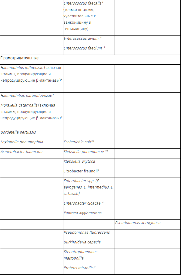* - Streptococcus pneumoniae с множественной резистентностью к антибиотикам включают штаммы, резистентные к пенициллину, и штаммы, резистентные к двум или более антибиотикам из таких групп как пенициллины (при МИК ≥ 2 мкг/мл), цефалоспорины II поколения (цефуроксим), макролиды, тетрациклины и триметоприм/сульфаметоксазол.