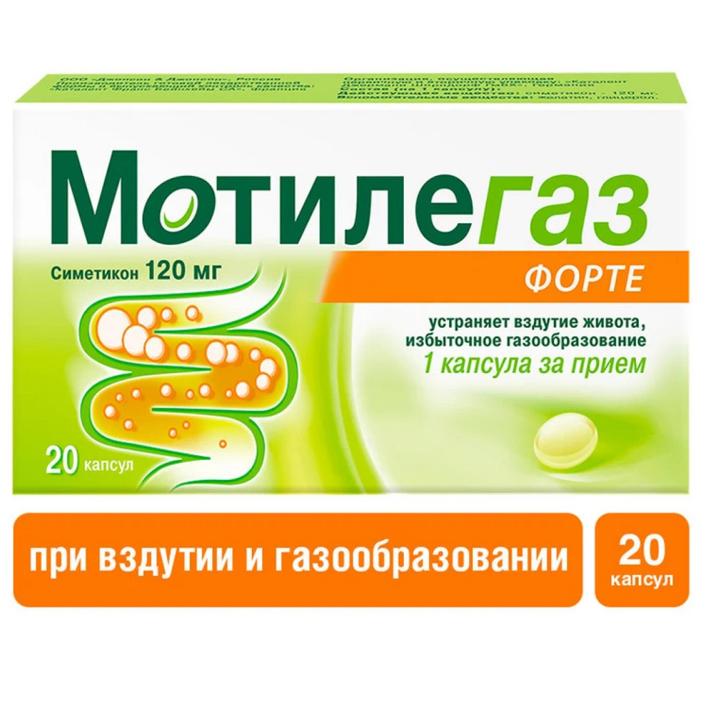 Все аналогиМотилегаз® Форте – это препарат, который борется со вздутием, повышенным газообразованием и болью (1). В отличие от ветрогонных средств, представленных на рынке в форме капсул с действующим веществом симетикон, одна капсула Мотилегаз содержит в три раза больше действующего вещества (2), поэтому для улучшения симптомов достаточно принять одну капсулу препарата вместо двух капсул такого средства. Удобная схема приема препарата предполагает прием всего трех капсул в день. Формула не содержит красителей. 1. Вызванной газообразованием. 2. По данным ГРЛС.