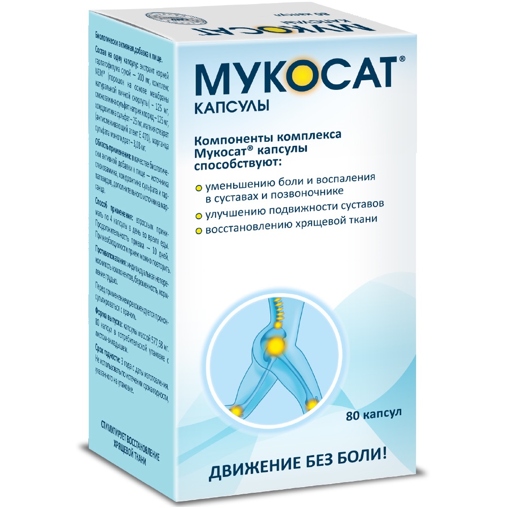 Мукосат® капсулы содержит важнейшие компоненты, необходимые для восстановления и поддержания здоровья суставов. Способствует уменьшению воспаления и боли в суставах, подавляя синтез простагландинов и ингибируя лейкоцитарную эластазу; помогает замедлению процесса сужения межсуставной щели, блокируя ингибиторы синтеза гиалуроновой кислоты; а также препятствует разрушению хряща, предотвращая повышение уровня ферментов (ММП-9), способствующих запуску костной и хрящевой деградации.