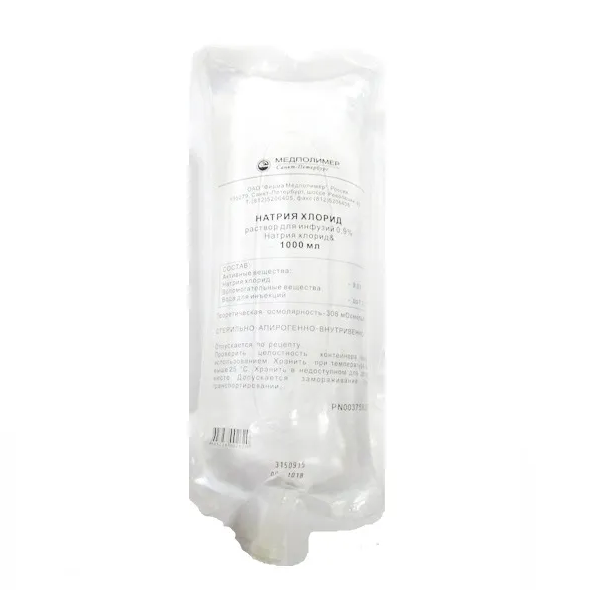 Симптомы: тошнота, рвота, диарея, спастическая боль в животе, жажда, пониженное слюно- и слезоотделение, повышенное потоотделение, лихорадка, тахикардия, повышение артериального давления, почечная недостаточность, периферические отеки, отек легких, остановка дыхания, головная боль, головокружение, беспокойство, раздражительность, слабость, мышечные судороги и ригидность, генерализованные судороги, кома и смерть. Избыточное введение раствора натрия хлорида 0,9% может вызвать гипернатриемию. Избыточное поступление хлорида в организм может приводить к гиперхлоремическому ацидозу. Если раствор натрия хлорида 0,9% используется в качестве базового раствора для разведения и транспорта других препаратов, симптомы и жалобы при избыточном введении наиболее часто связаны со свойствами добавленных в раствор препаратов. В случае непреднамеренного избыточного введения раствора лечение следует прекратить и оценить состояние пациента.