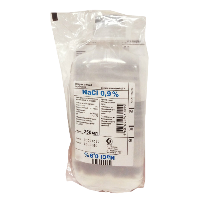 0,9% раствор натрия хлорида изотоничен плазме человека, и поэтому быстро выводится из сосудистого русла, лишь временно увеличивая объем циркулирующей крови (эффективность при кровопотерях и шоке недостаточна).