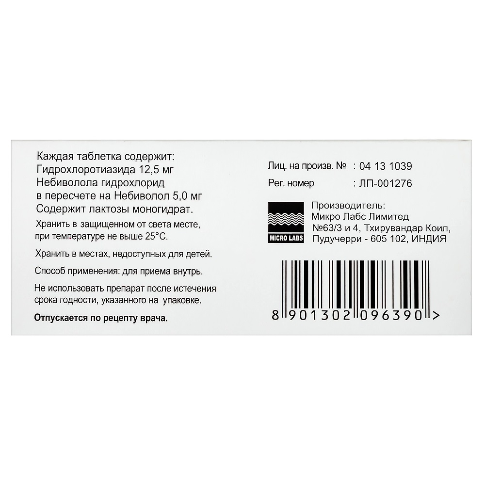 Активные вещества: небиволола гидрохлорид в пересчете на небиволол - 5,000 мг, Гидрохлоротиазид - 12,500 мг;