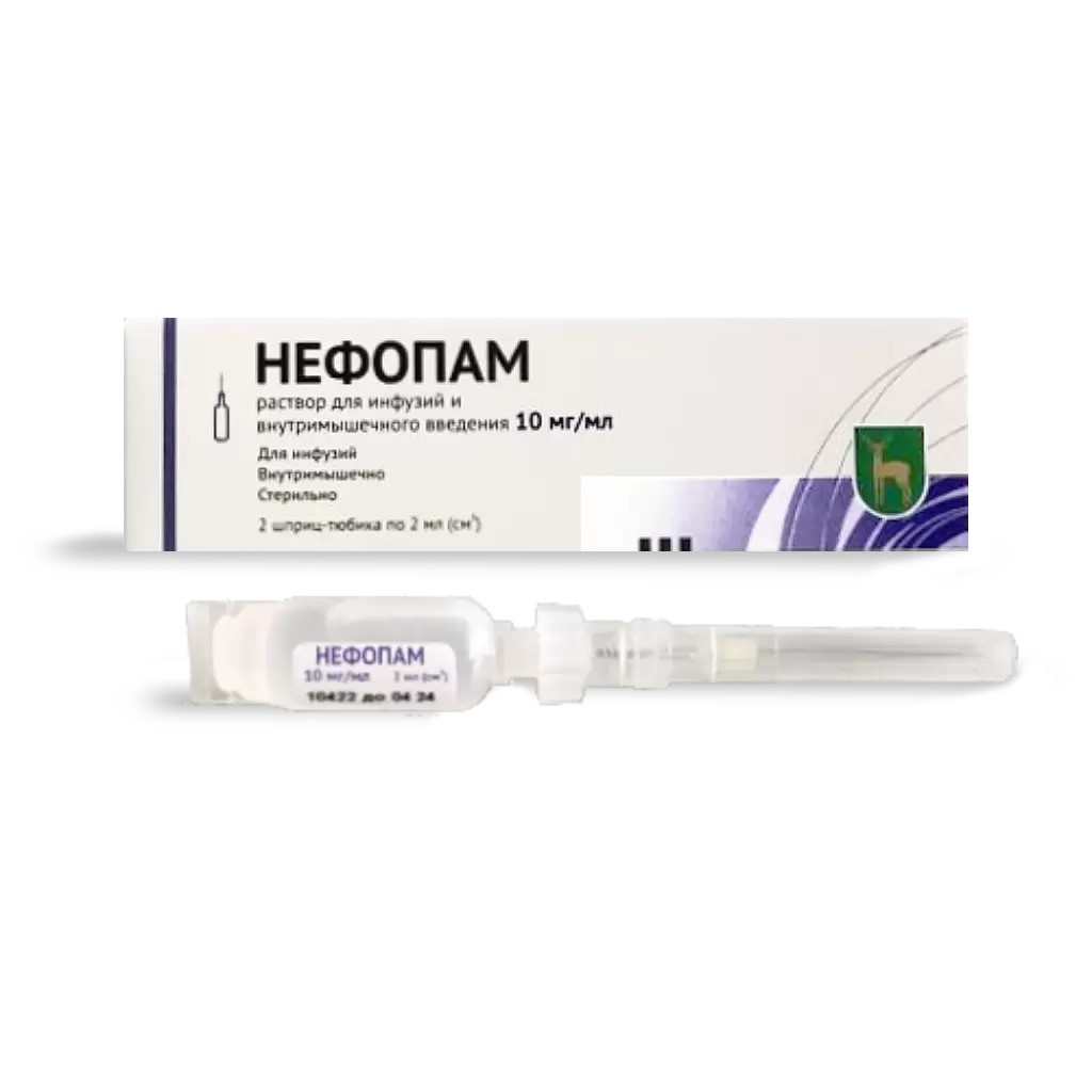 После введения одной дозы 20 мг внутримышечно, максимальная концентрация в сыворотке наблюдается через 30-60 минут и в среднем составляет 25 нг/мл. Период полувыведения составляет в среднем 5 часов. После внутривенного введения дозы 20 мг, период полувыведения (Т1/2) в среднем составляет 4 часа. Связывание с белками плазмы составляет 71-76 %. Биотрансформация значительна, идентифицированы три основных метаболита: десметилнефопам, нефопам N-оксид, N-глюкуронид нефопама. Десметилнефопам и нефопам N-оксид не глюкуронизируются в печени, не проявляют анальгезирующей активности в исследованиях на животных.