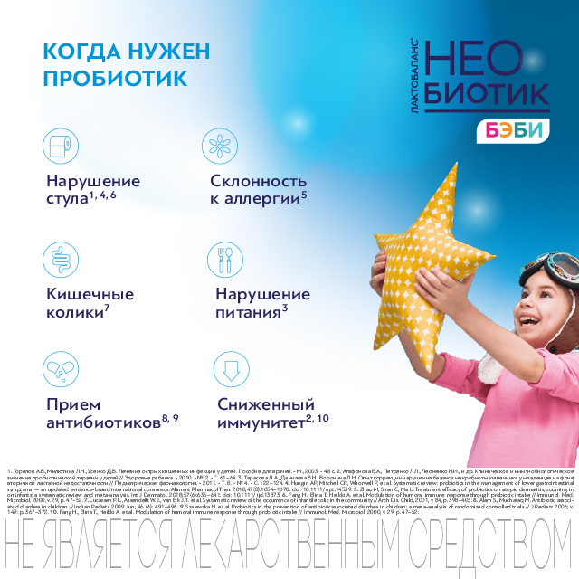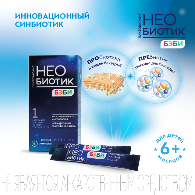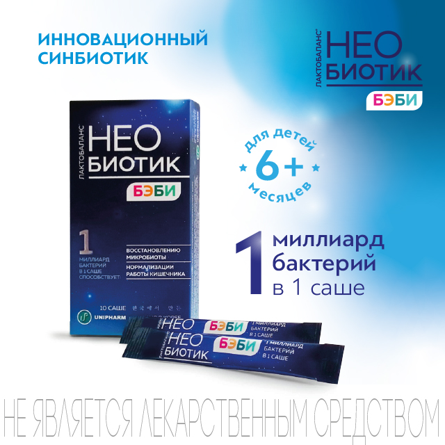 Необиотик Лактобаланс® Бэби - сбалансированная комбинация пробиотических микроорганизмов (бифидо- и лактобактерий) для детей с 6 месяцев для поддержания нормальной микробиоты кишечника, повышения защитной функции иммунной системы и общей резистентности детского организма, усвоения полезных веществ и синтеза важных витаминов и аминокислот.
