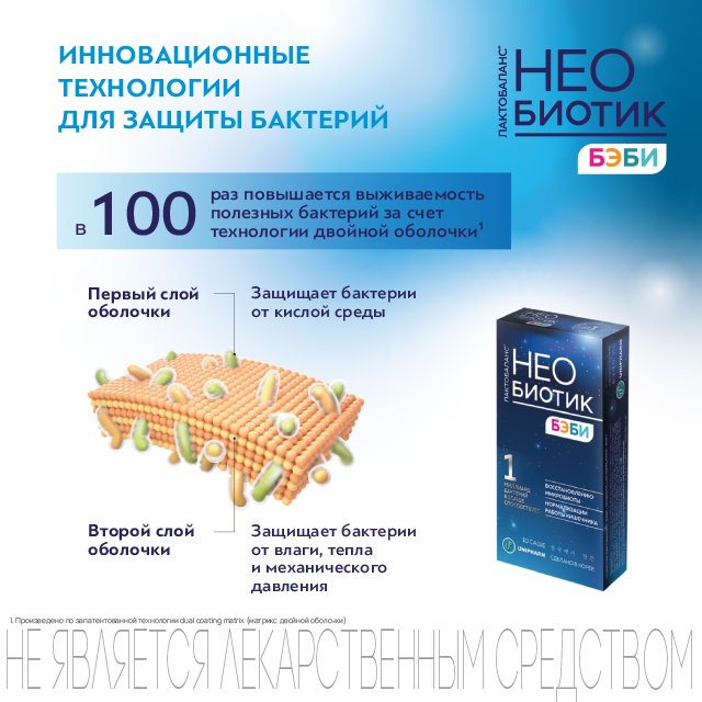 Благодаря технологии двойной оболочки происходит защита полезных бактерий, входящих в состав пробиотика Необиотик Лактобаланс® Бэби, и их гарантированная доставка в нужный отдел кишечника.