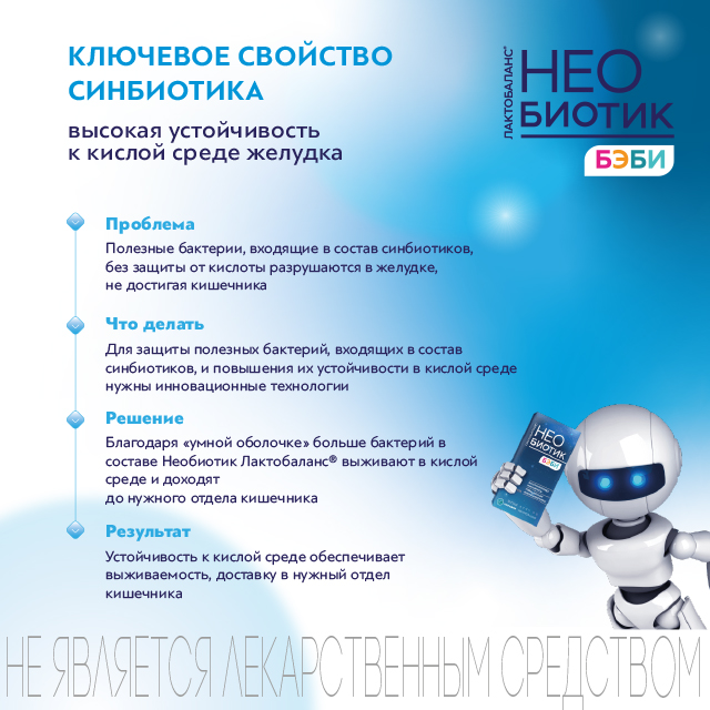 Пробиотические микроорганизмы, входящие в состав продукта Необиотик Лактобаланс® Бэби, характеризуются устойчивостью при комнатной температуре, не требуют хранения в холодильнике, сохраняют стабильность в течение всего срока годности, безопасны при использовании в соответствии с рекомендациями производителя.