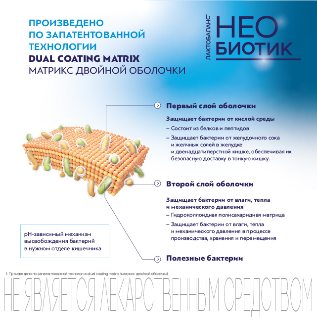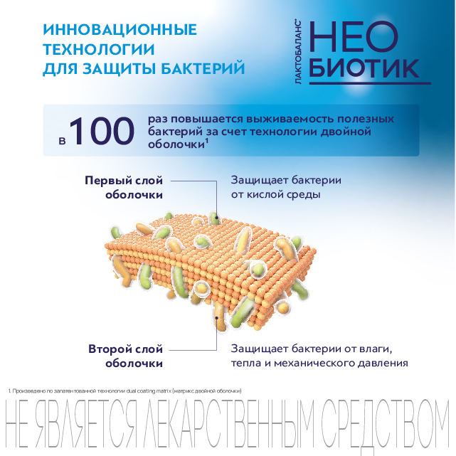 Благодаря технологии двойной оболочки происходит защита полезных бактерий, входящих в состав пробиотика Необиотик Лактобаланс®, и их гарантированная доставка в нужный отдел кишечника.