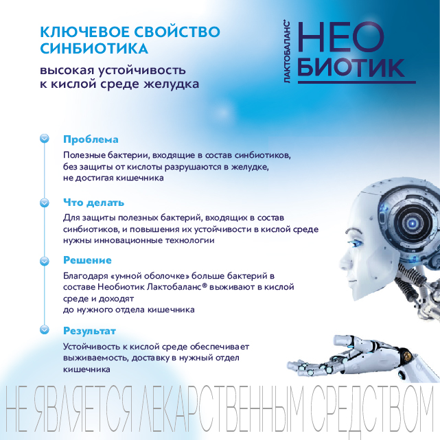 Необиотик Лактобаланс® - сбалансированная комбинация пробиотических микроорганизмов (бифидо- и лактобактерий), молочнокислых бактерий, пребиотиков для восстановления нормальной микробиоты кишечника, повышения защитной функции иммунной системы и общей резистентности организма человека, усвоения полезных веществ и синтеза важных витаминов и аминокислот.