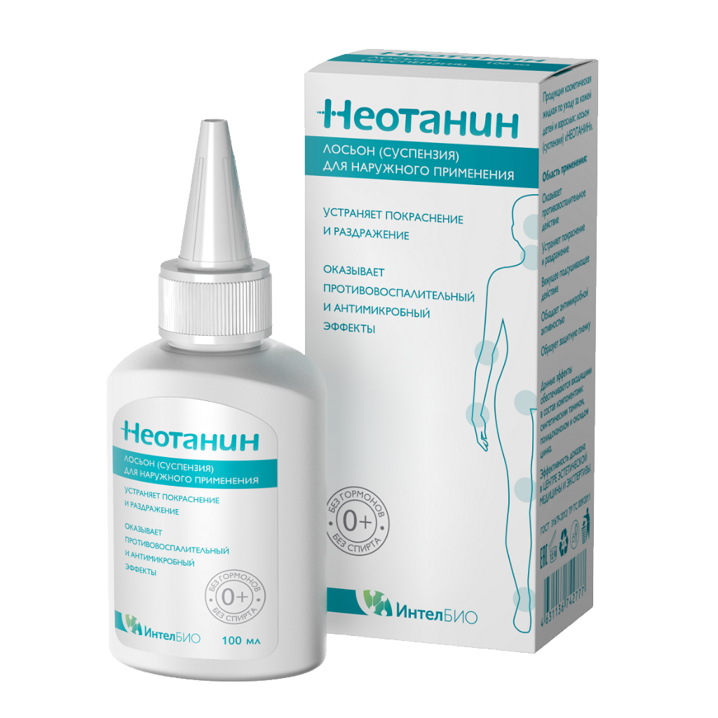 НЕОТАНИН лосьон (суспензия) для детей и взрослых При остром воспалении с мокнутием применяется НЕОТАНИН лосьон (суспензия): •противовоспалительное, подсушивающее и вяжущее действие с антисептическим эффектом •двойное противозудное действие •быстрый противозудный эффект (в течение нескольких минут) •более выраженный клинический эффект и сокращение сроков лечения по сравнению c классическими формами местной терапии •не содержит гормонов •применение не приводит к системным побочным эффектам •применяется у детей с рождения •при локализации поражения на лице •при обширных (более 20% поверхности кожи) площадях поражения •у пациентов со стероидофобией (20—40% пациентов) •у пациентов с тяжелой сопутствующей соматической патологией •минимальный риск побочных реакций •не окрашивает кожу •отпускается без рецепта Механизм действия: Основным активным компонентом НЕОТАНИНА является синтетический танин. Танины относятся к веществам, оказывающим вяжущее, подсушивающее действие благодаря способности связывать и осаждать протеины (белки). Вторым активным компонентом НЕОТАНИНА является полидоканол, который обладает противозудным действием. Противозудный эффект полидоканола развивается быстро, длительность действия составляет в среднем 3–4 часа. Также полидоканол усиливает вяжущее, подсушивающее действие танина и способствует заживлению эрозий. Третьим активным компонентом НЕОТАНИНА лосьона (суспензии) является оксид цинка. Оксид цинка относится к веществам, оказывающим: вяжущий эффект – связывает белки кожи и белки тканевой жидкости в тонкую пленку на поверхности кожи и подсушивающее действие - уменьшает выраженность экссудативных процессов. Механизм действия НЕОТАНИНА Связывает белки тканевой жидкости в тонкую пленку. Предотвращается проникновение бактерий. Кожа подсушивается и регенерирует быстрее. Угнетает активность прововоспалительных ферментов. Блокирует передачу импульсов чувствительным нервным окончаниям. Лечебный эффект Создает условия для быстрого заживления поврежденных участков кожи. Aнтисептический эффект. Помогает защитить поврежденные участки кожи от микробного воздействия и зуда. Противовоспалительный эффект. Устраняет покраснение и раздражение. Устраняет зуд, боль и раздражение. Область применения: Состояния кожи, сопровождающиеся нарушением целостности кожного покрова, мокнутием, раздражением и зудом. В том числе: •при обострении атопического, аллергического, контактного дерматита, экземе, псориазе и т.п. •при пеленочном (памперсном) дерматите •при ветряной оспе, герпесе, опоясывающем лишае и т.п. •при грибковых поражениях кожи с эрозиями и трещинами •при поверхностных пиодермиях •при всех дерматозах, сопровождающихся зудом (т.к. в составе полидоканол, который оказывает противозудное действие через несколько секунд после нанесения на кожу).