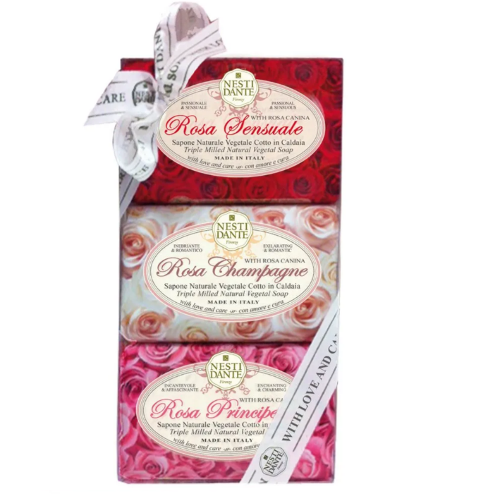 В составе набора «Роза» Rosa бренда Nesti Dante – мыло (3 штуки): Роза из Кампаньи, Чувственная роза и Роза принцесса.