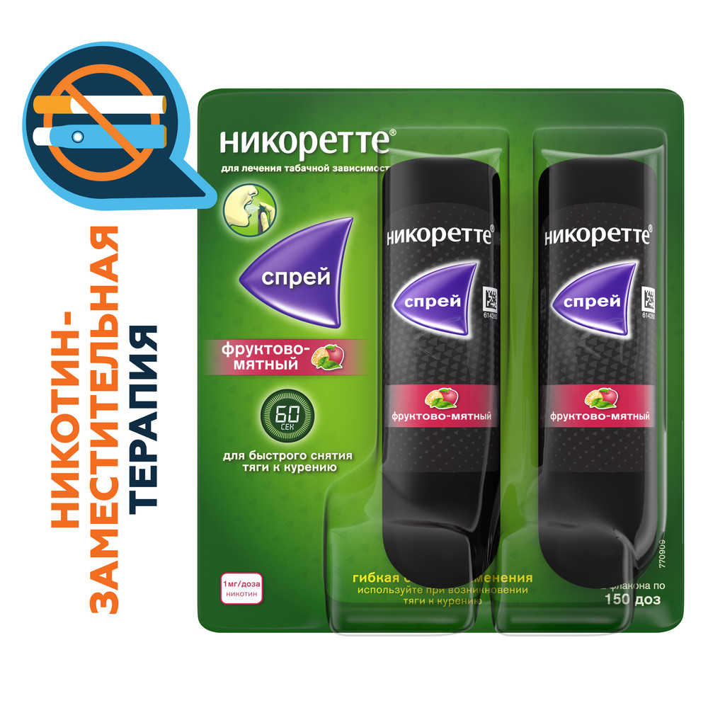 Спрей Никоретте® помогает бороться с тягой к курению, активируясь за 60 секунд (2). По сравнению с обычным средством имеет более мягкий (3) фруктово-мятный вкус.
