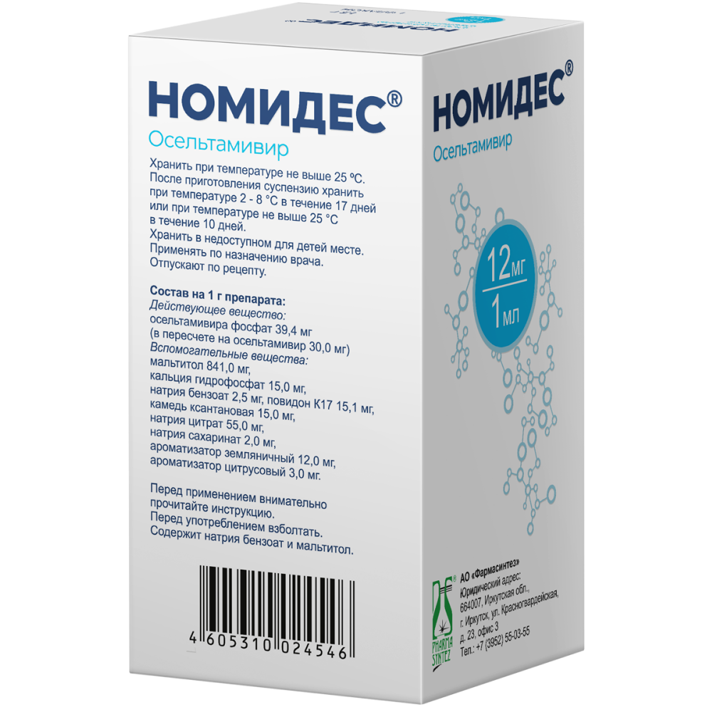 Действующее вещество: осельтамивира фосфат (в пересчете на осельтамивир) - 39,4 мг (30,0 мг);